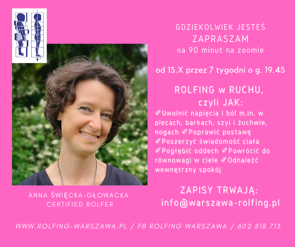 Mailem: info@rolfing-warszawa.pl Zapisując się podaj proszę adres email, na który będę mogła wysłać link do wydarzenia. Potwierdzeniem uczestnictwa jest przelew dołączony do maila. Jeśli masz wątpliwości czy to dla Ciebie warsztat, zadzwoń / napisz – chętnie odpowiem na pytania. A jeśli znasz kogoś, kto może skorzystać z tych zajęć, przekaż proszę dalej tego maila. Serdecznie zapraszam, nie mogąc doczekać się kiedy zaczniemy nasze spotkania- Wasza Rolferka.